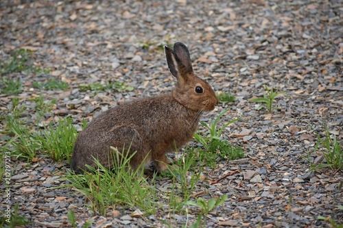 Fototapeta premium Wild rabbit sitting in weeds and shale