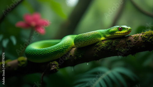 © Roman, Obraz premium Wild rainforest viper with vivid red-orange eyes and water-dappled scales in tropical light.