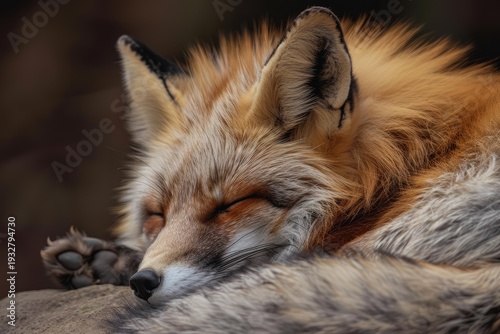 © nsit0108, Naklejka premium Wild red fox resting on a rock, enjoying a peaceful moment in nature