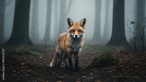 Obraz premium Wild red fox standing alert in a mysterious, misty forest environment
