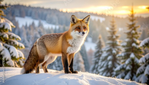Fototapeta premium Wild red fox stands majestically on snowy mountain ridge during golden sunrise with winter forest backdrop
