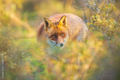 © Sander Meertins, Obraz premium Wild red fox Vulpes Vulpes scavenging in a green meadow