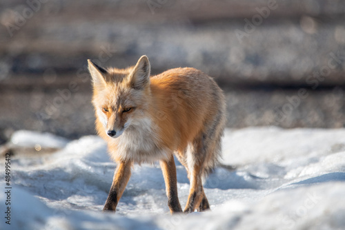 © Scalia Media, Obraz premium Wild red fox walking along a lake shore in spring time with beautiful fur, coat.