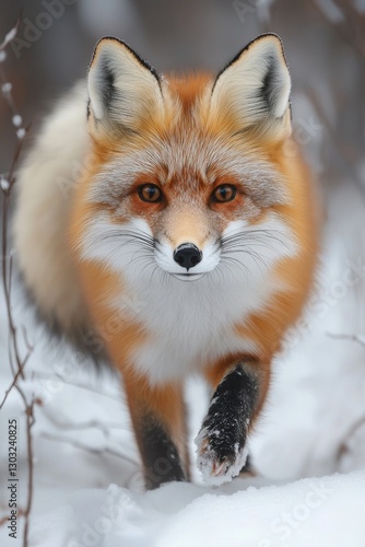 © Michael, Obraz premium Wild red fox walking through a snowy forest in winter