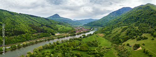 © NemanTraveler, Obraz premium Wild river in mountain valley. Green mountain hills