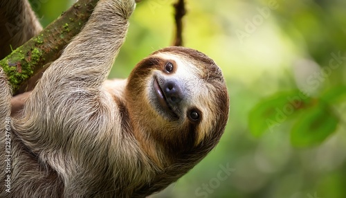 © netsay, Naklejka premium Wild Sloth Posing Humorously on a Rainforest Branch A Captivating Portrait of Natures Quirky Humor, Showcasing a Playful Mammal in a Lush Green Environment. characters