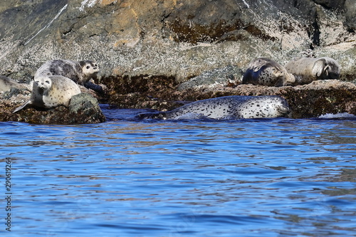 © Nick Kashenko, Fototapeta premium Wild spotted seals Phoca largha on the coastal rocks closeup. Largha seal on the sea rock near the blue water. Wild mammals in natural habitat. Cute animals closeup.