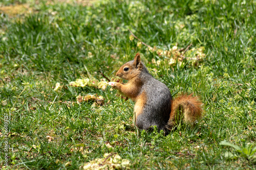 © seval, Fototapeta premium Wild squirrel eating flower in the forest. A very cute redhead squirrel on green grass. Beautiful squirrel with fluffy tail