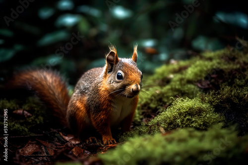 © Melipo-Art, Fototapeta premium Wild squirrel in the green forest, rainy day.