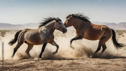 Fototapeta premium Wild Stallions Fighting in a Dusty Desert Landscape