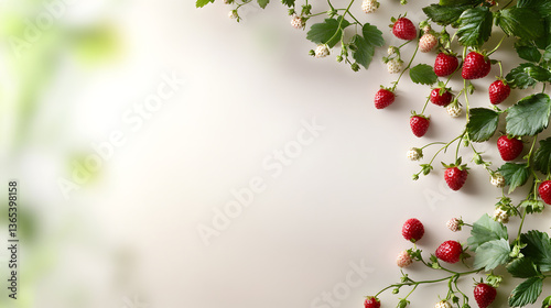 © Rina Mskaya, Fototapeta premium Wild strawberries and green leaves border on soft white background. Great for organic ads, summer fruit designs or natural product packaging. Selective focus