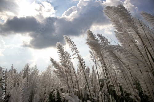 © Arnav, Fototapeta premium Wild Sugarcane or Saccharum Spontaneum in Daylight with Clouds, Also Known as Kans Grass or Kash Phool