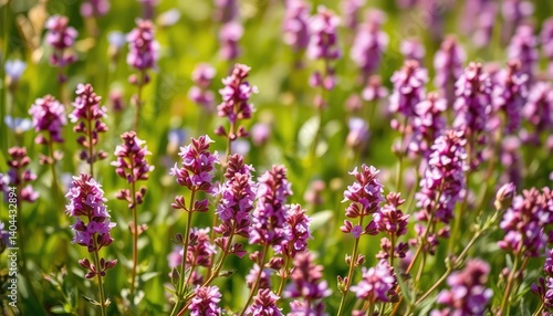 Fototapeta premium Wild thyme blossoms in vibrant summer meadow, sunlight dappled on delicate...