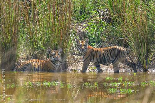 © MATRISHVABHASKAR, Fototapeta premium wild tiger cubs in the wild water