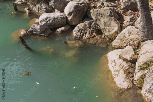 © Andrii Oleksiienko, Fototapeta premium Wild turtles swimming in water near stony rock in canyon in Turkey