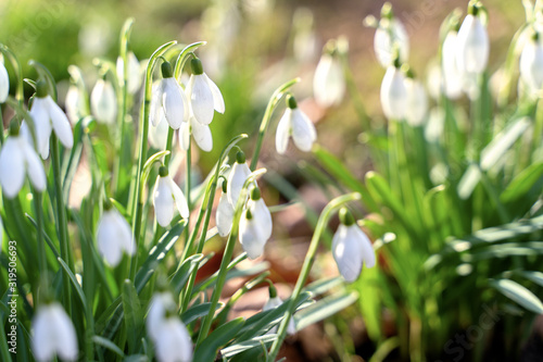 Fototapeta premium Wild white snowdrops growing from the forest ground