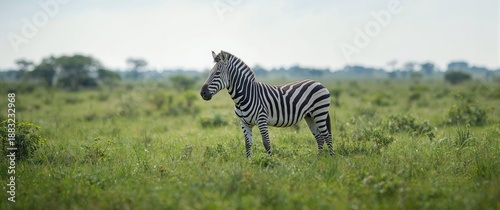 Fototapeta premium Wild zebra amidst vibrant green grass in nature