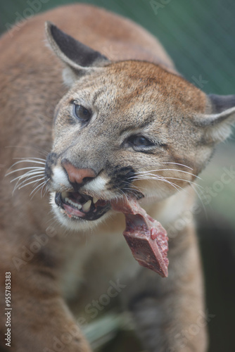 © christian vinces, Obraz premium Wildcat devouring a piece of meat in detailed close-up