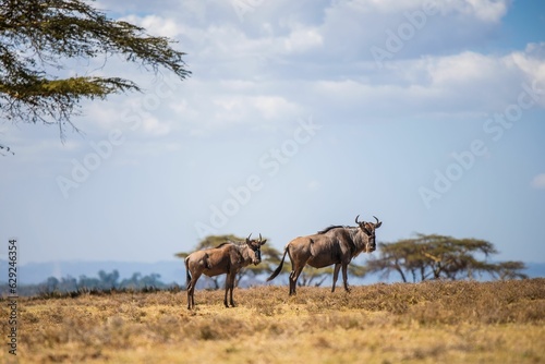 Naklejka premium Wildebeest at the crescent island in Lake Naivasha, Kenya.