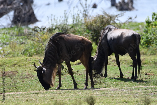 Fototapeta premium Wildebeest graze peacefully on the African savanna