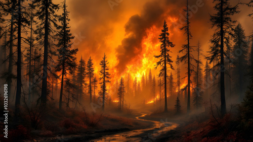 Naklejka premium Wildfire Blaze in Forest Environment at Dusk