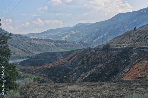 Fototapeta premium Wildfire destruction along the Thompson River north of Spence Bridge