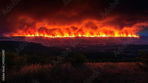 Naklejka premium Wildfire Raging Across Mountain Ridge During Nighttime Creating Dramatic...