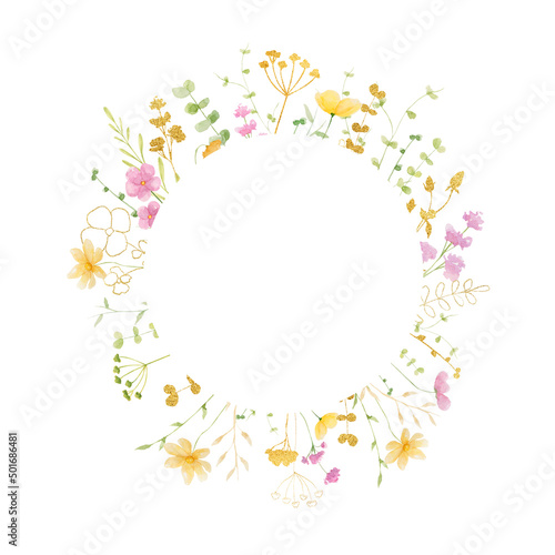 © Tanya Trink, Fototapeta premium Wildflower golden summer watercolor floral frame on white background. Wedding invitation.