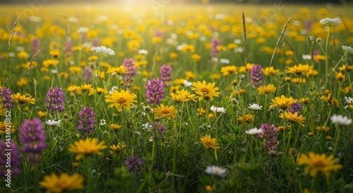 © Manji, Obraz premium Wildflower Meadow with Daisies and Lupines in Sunlight