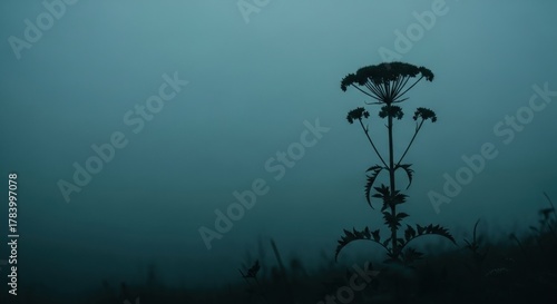 © Mr. Stocker, Fototapeta premium Wildflower silhouette in atmospheric morning fog. Minimalist nature concept with dramatic lighting. Mysterious and moody outdoor scene for environmental storytelling or design