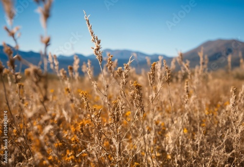 © KarpenArt Studio, Fototapeta premium Wildflowers and wheat grass growing in a field with mountains in the background.