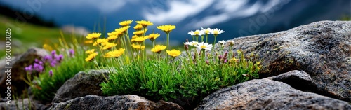 © BrandwayArt, Fototapeta premium Wildflowers bloom on rocky Alpine meadow