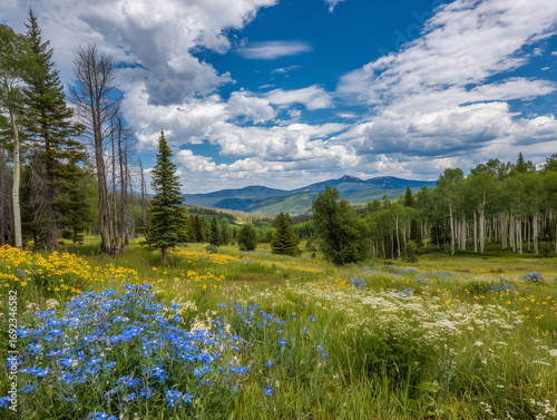 © Atlantis, Fototapeta premium Wildflowers blooming in a mountain meadow landscape