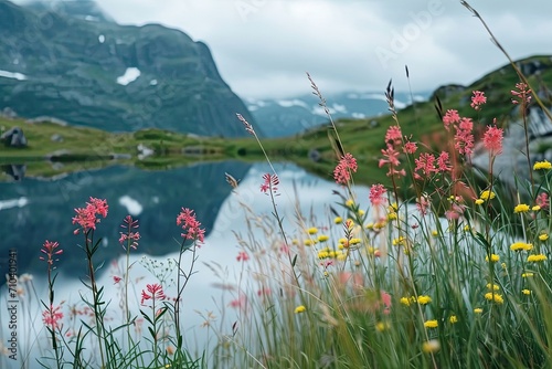 Obraz premium Wildflowers Blooming in Front of Mountain Lake