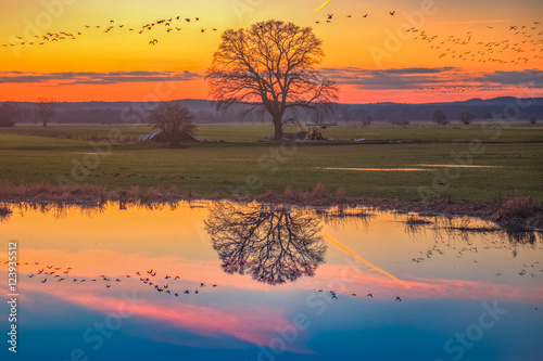 © Maik Richter, Obraz premium Wildgänse über der Elbtalaue / Sonnenuntergang über der Elbtalaue. Aufgenommen in der Nähe von Predöhlsau bei Dannenberg, (Naturpark Elbhöhen-Wendland, Niedersachsen), am 16.02.2016.