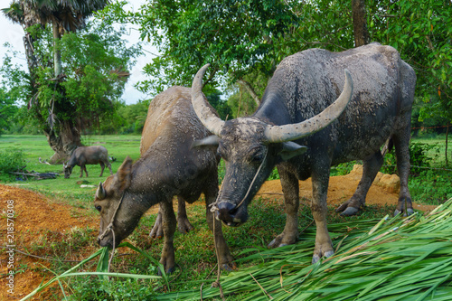 © khobenz, Fototapeta premium Wildlife Buffalo muddy body eating grass.
