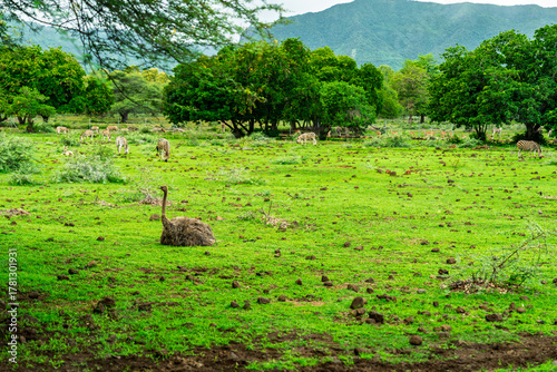 © ronedya, Obraz premium Wildlife composition: a giant ostrich and a herd of zebras coexisting on the vibrant green pasture of a safari reserve
