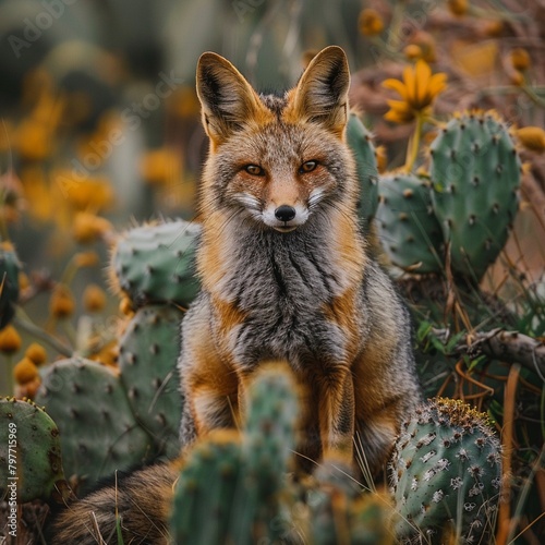 © Natalia, Fototapeta premium Wildlife documentary style shot of a desert fox near a cactus during a wet La Nina year