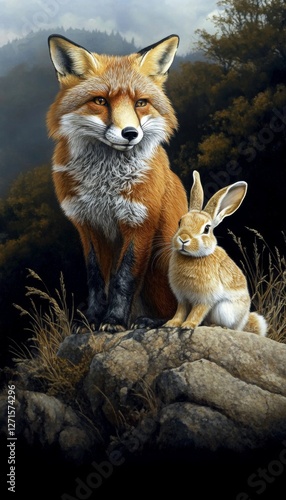 © Ilja, Fototapeta premium Wildlife Harmony A Majestic Red Fox and a Gentle Rabbit Share a Moment of Serenity in Nature