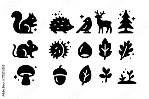 © Настя Шевчук, Naklejka premium Wildlife Icon Collection. Wildlife and Chestnuts. Solid icons set of Wildlife and Chestnuts: squirrel, hedgehog, bird, deer, mouse, chestnut burr, fallen nut,