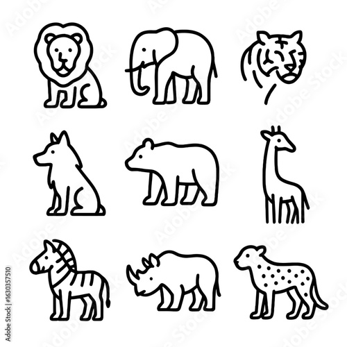 © Coosh448, Naklejka premium Wildlife Icon Set. Outline icon set of wild animals: lion, elephant, tiger, wolf, bear, giraffe, zebra, rhinoceros, cheetah. Line