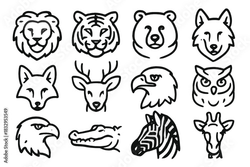 © Fortune228, Naklejka premium Wildlife Icons Collection. Wildlife Collection linear icon set: lion, tiger, bear, wolf, fox, deer, eagle, owl, hawk, crocodile, zebra, giraffe