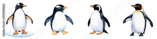 Fototapeta premium wildlife impact harmony concept. Four cartoon penguins in various poses, showcasing their distinct black and white feathers, orange beaks, and playful demeanor.