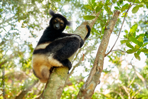 Naklejka premium Wildlife Madagascar, indri monkey portrait, Madagascar endemic. Lemur in nature vegetation. Sifaka on the tree, sunny evening. Monkey with yellow eye. Nature forest tree habitat.