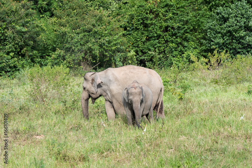 © chanwitohm, Fototapeta premium Wildlife of family Asian Elephant walking and looking grass for food in forest. Kui Buri National Park. Thailand.