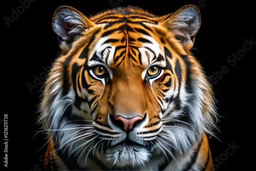 © ChannelPIC, Fototapeta premium Wildlife portrait: A close-up of a magnificent tiger's face, set against a dramatic black backdrop.