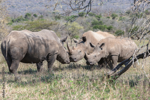Fototapeta premium Wildlife Rhinos Calf Courting Touching Mating Season