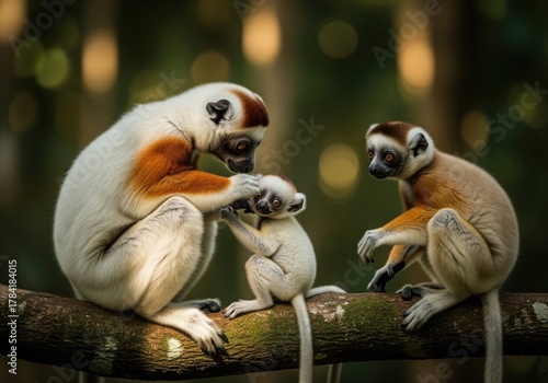 Obraz premium Wildlife scene of sifaka lemur family grooming their baby on a jungle branch