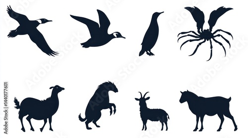 Obraz premium Wildlife Silhouettes Birds flying and animals standing against a white backdrop, for graphic design