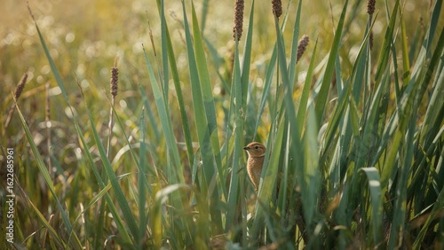 © TheWaterMeloonProjec, Fototapeta premium Wildlife snapshot of a bird blending into bulrushes, colorful natural environment in spring and summer